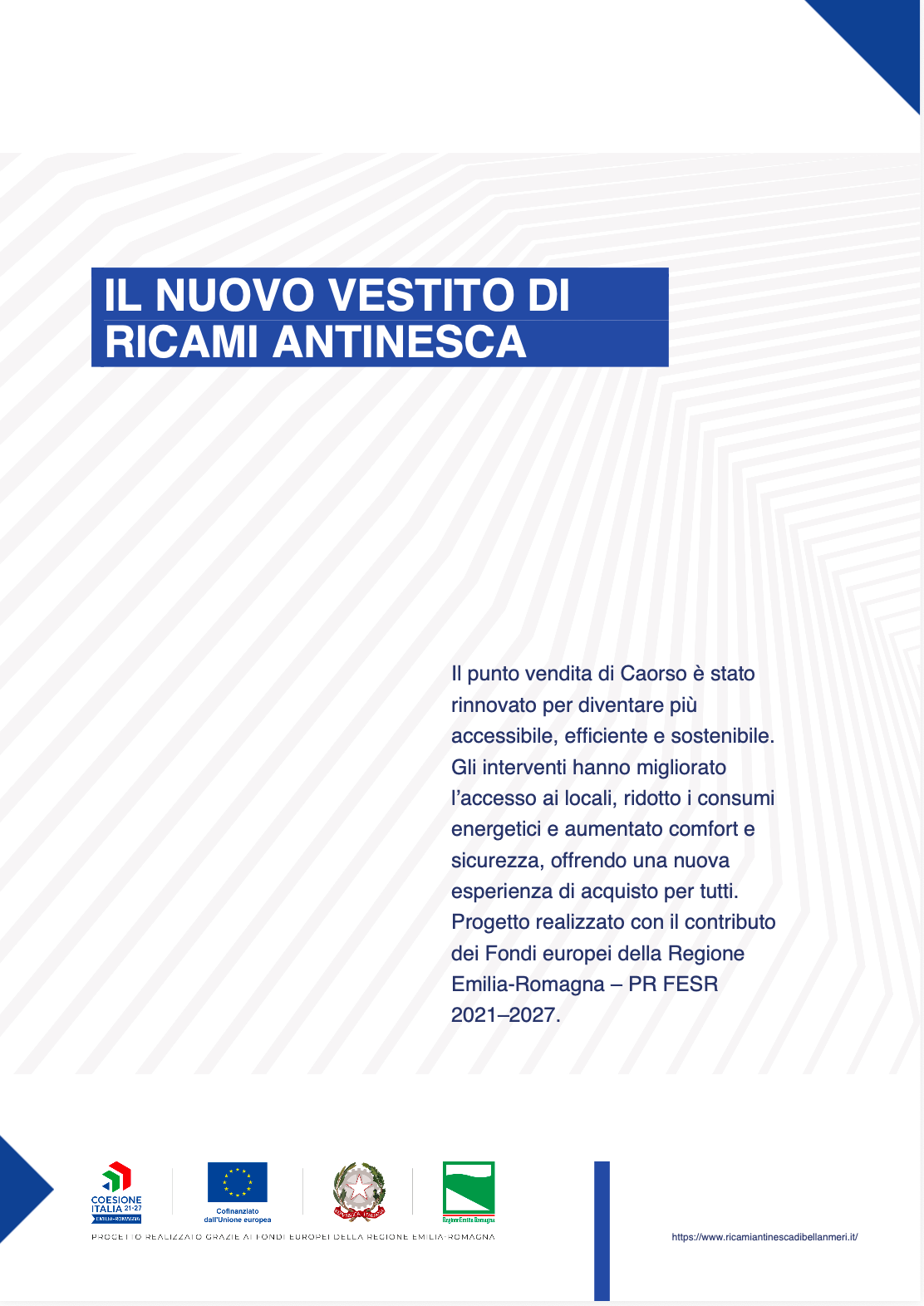 IL NUOVO VESTITO DI RICAMI ANTINESCA Il punto vendita di Caorso è stato rinnovato per diventare più accessibile, efficiente e sostenibile. Gli interventi hanno migliorato l’accesso ai locali, ridotto i consumi energetici e aumentato comfort e sicurezza, offrendo una nuova esperienza di acquisto per tutti. Progetto realizzato con il contributo dei Fondi europei della Regione Emilia-Romagna – PR FESR 2021–2027.